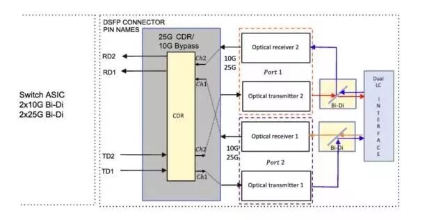 2个通道的25G BIDI 用于同SFP28封装尺寸下,实现设备端口密度不变的情况下,速率翻倍,提高了设备端口吞吐量;