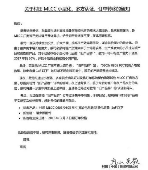 此前,村田曾向客户发送订单转移通知,称由于整体需求增长幅度大,公司必须将增产资源集中于市场需求高、生产难度大的小尺寸先端产品和高性能产品。对于已经存在小型化替代品的“旧产品群”(0603/085尺寸的高介电常数型、静电容量1uF以下),将生产能力下调至2017年的50%。